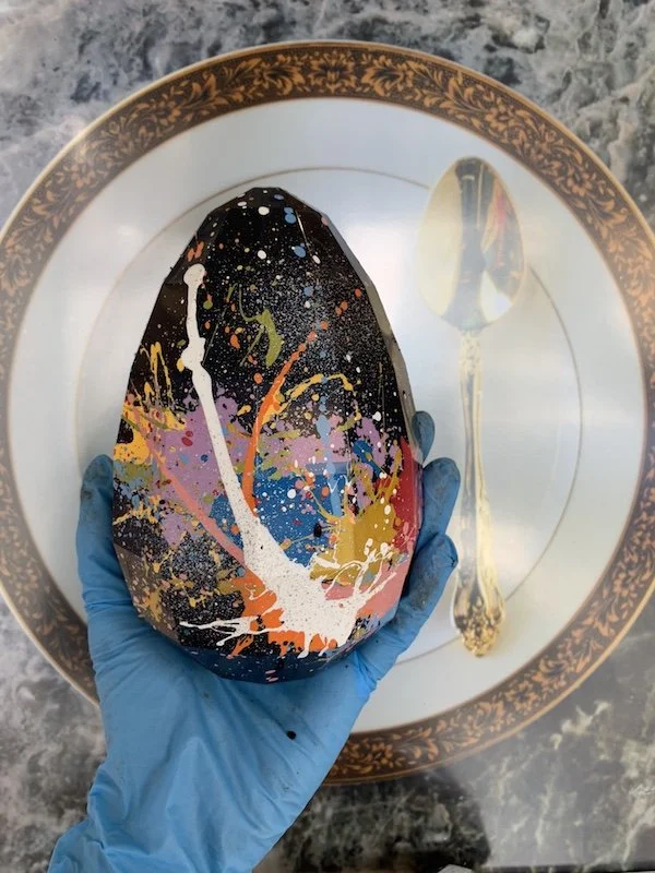 Disco Egg at CXBO. Hand painted with coloured cocoa butter and casted with dark chocolate, lined with ancho chilies, ground coffee and dried apricots, then filled with aerated milk and white chocolate.